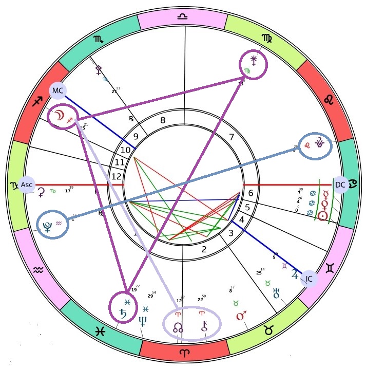 Kesäpäivänseisauksen kartalla on Kuun neliöt Saturnukselle sekä Junolle. Tästä muodostuu T-risti kuvio. Kuu on jousimiehen tulimerkissä, joten luonteeltaan se voi olla levoton ja liiallisuuksiin menevä. Saturnuksen mukana olo rauhoittaa ja maadoittaa sitä, vaikkakin paikoin se voi tuntua ärsykkeeltä. Juno on edustaa avioliittoa, kumppanuutta, sitoutumista ja niitä haasteita ja voimavaroja, jotka liittyvät pitkäaikaisiin ihmissuhteisiin. Juno nimettiin roomalaisen jumalattaren mukaan, joka oli Jupiterin puoliso ja avioliiton suojelija. Juno voi paljastaa, miten ihmiset tasapainottavat roolit suhteissaan ja miten he käsittelevät vallan ja vastuun jakamista. Junon haasteellisissa aspekteissa saatamme kohdata hylätyksi tulemisen pelkoa ja turvattomuutta. Junon tarkastelu auttaa ymmärtämään yksilön henkilökohtaisia tarpeita ja odotuksia suhteissa, mikä voi auttaa luomaan terveempiä ja tasapainoisempia ihmissuhteita. Kuun kolmiot Kuunnoususolmulle ja Khironille auttaa näkemään mitkä vaihtoehdot ovat elinvoimaisimpia ja missä on mukana parantavaa eliksiiriä. Tämä voi olla energisoiva ja puhdistava kuvio.
