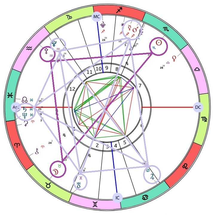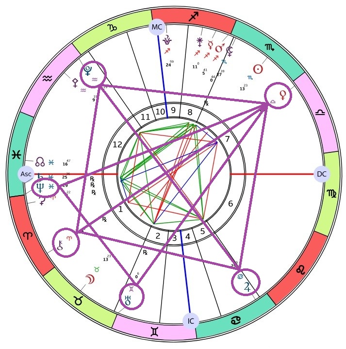 Venuksen kvinkunssit Neptunukseen ja Uranukseen saa aikaan Jod-suurkuvion. Tämä asetelma luo voimakkaan, mutta hienovaraisen jännitteen, joka ohjaa kohti elämäntehtävää tai sisäistä kasvua. Venuksen osallistuessa kuvioon teemat liittyvät ihmissuhteisiin, arvoihin ja siihen, miten ihminen ilmaisee rakkautta ja vastaanottaa sitä. Neptunuksen kvinkunssi tuo mukanaan idealismia, herkkyyttä ja joskus myös hämärtyneitä rajoja rakkaudessa tai arvoissa. Uranuksen kvinkunssi puolestaan herättää tarvetta vapauteen, omaperäisyyteen ja äkillisiin muutoksiin. Ristiriita idealismin (Neptunus) ja vapaudenkaipuun (Uranus) välillä voi pakottaa etsimään uudenlaista tasapainoa. Usein tällainen kuvio toimii herätyksenä – se voi ilmetä esimerkiksi yllättävän ihmissuhteen, taiteellisen inspiraation tai sisäisen kriisin muodossa, joka avaa oven suurempaan ymmärrykseen omista tunteista ja todellisista arvoista.